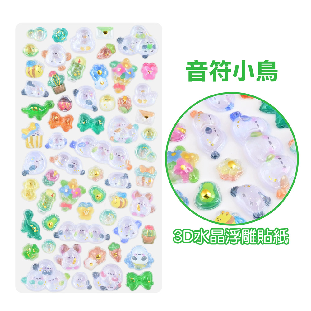 《3D水晶浮雕貼紙──音符小鳥》裡面有可愛的小鳥,蜜蜂、小雞、花朵、仙人掌、蝴蝶結等多種造型。3D立體浮雕造型+水晶透明感的貼紙讓大朋友、小朋友都愛不釋手!