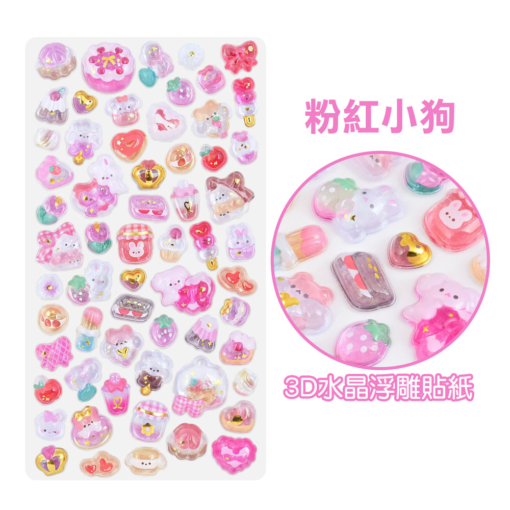 《3D水晶浮雕貼紙──粉紅小狗》裡面有可愛的小狗,兔子、草莓、蝴蝶結等多種造型。3D立體浮雕造型+水晶透明感的貼紙,讓大朋友、小朋友都愛不釋手!