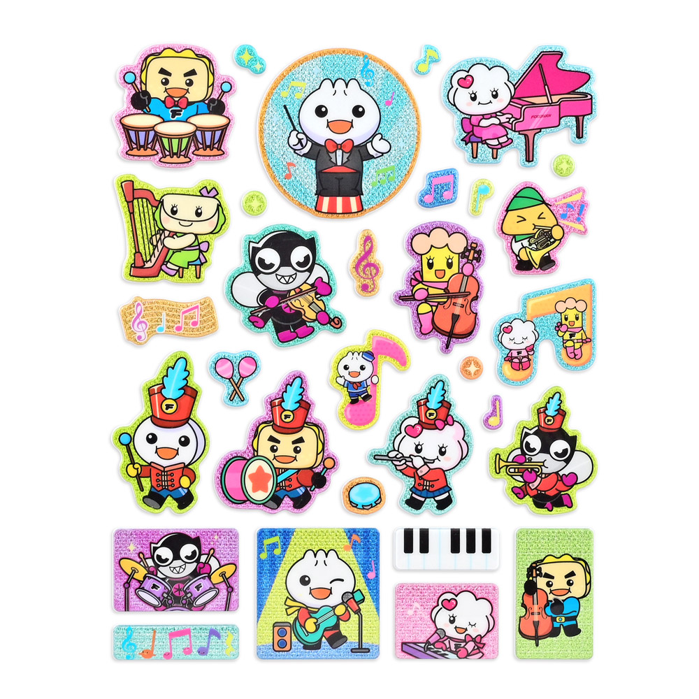 《FOOD超人閃亮泡泡貼紙-瘋狂音樂節》裡面FOOD超人、心心水餃、大力燒餅等一行人,化身小小音樂家,趣味又可愛的風格與金粉裝飾的多種造型,適合各種創意活動,可用來做裝飾、寫手帳、寄信,讓大朋友、小朋友都愛不釋手!