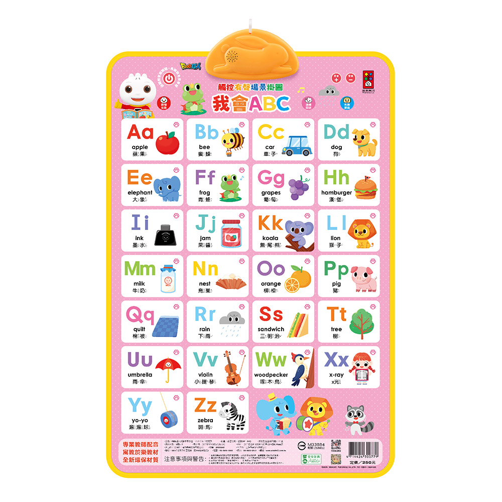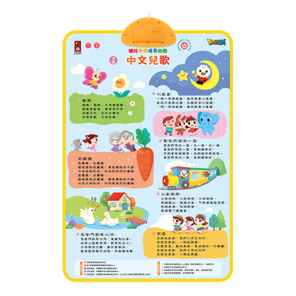 《FOOD超人有聲學習掛圖-ABC&中文兒歌》雙面不同的學習主題,同時學習ABC英文字母以及律動兒歌一起唱唱跳跳,兩種主題一次滿足!只要用手指輕輕一按即能發聲,加上多種功能建切換學習模式,也有問題遊戲幫助小朋友加深學習印象與強化互動閱讀性,並還有歡 唱兒歌,陪伴孩子一起唱唱跳跳學語言、學知識!