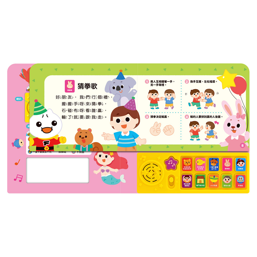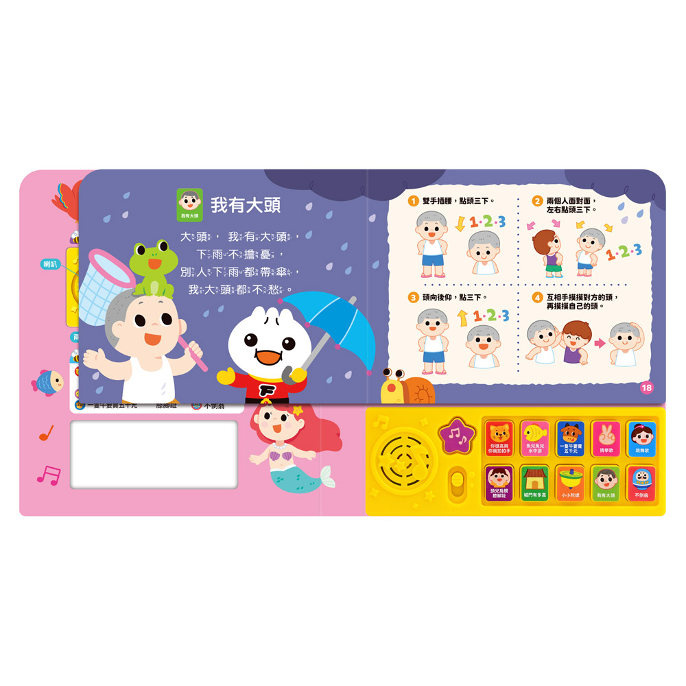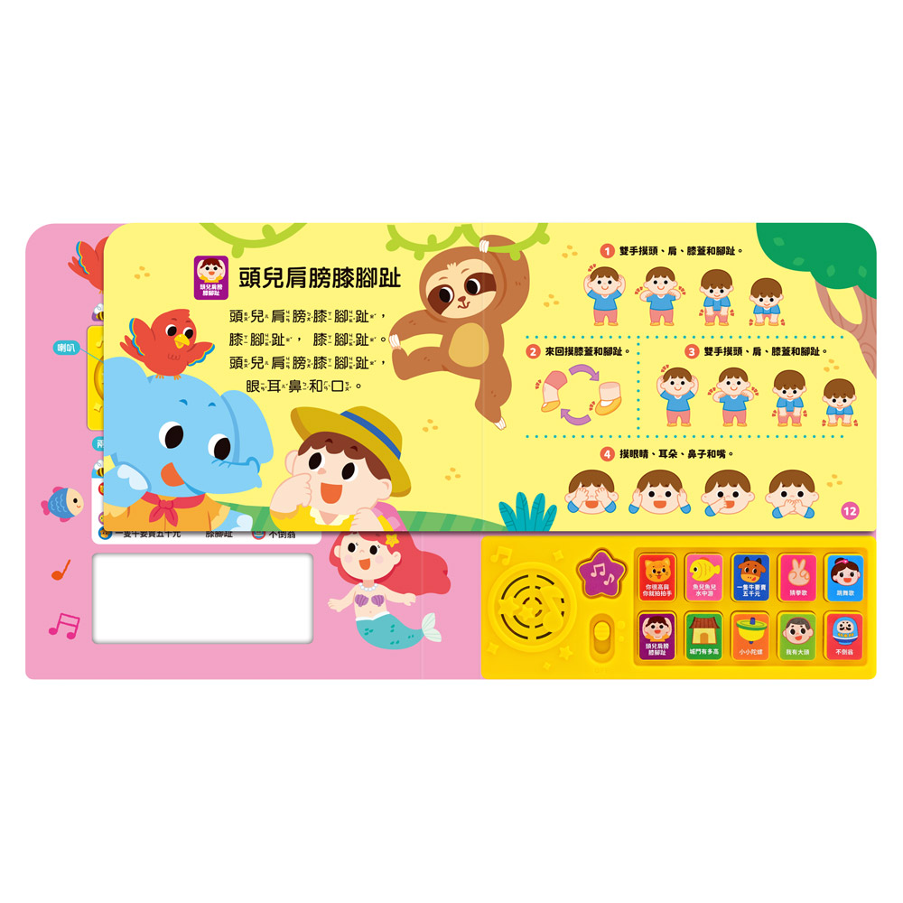 小手輕輕按,即可聽到可愛又童趣的歌謠與音樂伴奏,刺激聽覺發展。