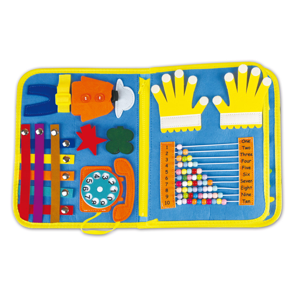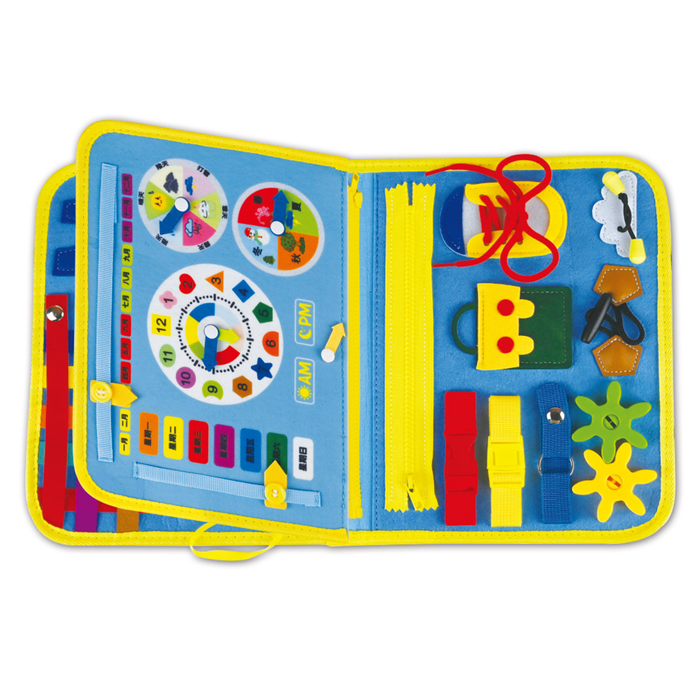 這是一本專為學齡前兒童設計的多功能早教布書,透過各式生活化操作機關,幫助孩子從玩樂中學習基本技能、提升認知與動手能力。